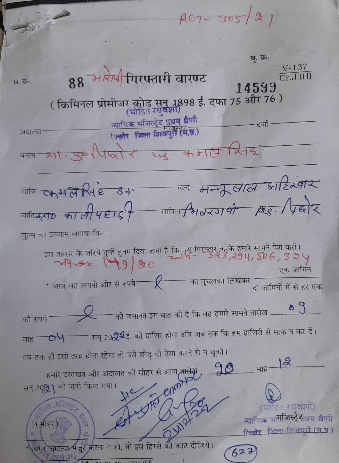 शिवपुरी। दिनांक 9/3/22। पुलिस अधीक्षक शिवपुरी राजेश चंदेल ,अतिरिक्त पुलिस  अधीक्षक शिवपुरी प्रवीण कुमार भूरिया , एसडीओपी पिछोर दीपक सिंह तोमर के निर्देशन में व टीआई पिछोर गब्बर सिंह गुर्जर के नेतृत्व  में लगातार स्थाई व  गिरफ्तारी वारंट तामील का अभियान चलाया जा रहा है इसी तारतम्य में  मुखबिर की सूचना पर ग्राम काली पहाड़ी भितरगंवा थाना पिछोर से मारपीट  के प्रकरण में वांटेड गिरफ्तारी वारंटी  कमल सिंह अहिरवार पुत्र मन्नूलाल निवासी ग्राम काली पहाड़ी भितरगवां थाना पिछोर जिला शिवपुरी को गिरफ्तार किया । वारंटी ने वर्ष 2020 में काली पहाड़ी भितरगंवा में फरियादी सुरेंद्र अहिरवार को अश्लील गालियां देकर मारपीट कर चोटें पहुंचाई व जान से मारने की धमकी दी थी ।  पुलिस थाना पिछोर टीम में  सहायक उप निरीक्षक जहान सिंह ,शैलेंद्र सिंह चौहान , प्रधान आरक्षक प्रतिपाल सिंह चौहान की मुख्य भूमिका रही।