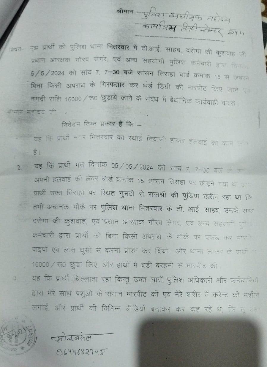 पुलिस मारपीट के शिकार हलवाई ने बताया कि थाने से छूटने के बाद मेने पुलिस कर्मियों के इस कृत्य की शिकायत आवेदन देकर एसडीओपी जितेंद्र नगाइच से की। उन्होंने कोई सुनबाई नहीं की तो जिला पुलिस अधीक्षक और पुलिस महानिदेशक से भी आवेदन देकर न्याय की गुहार लगाई।