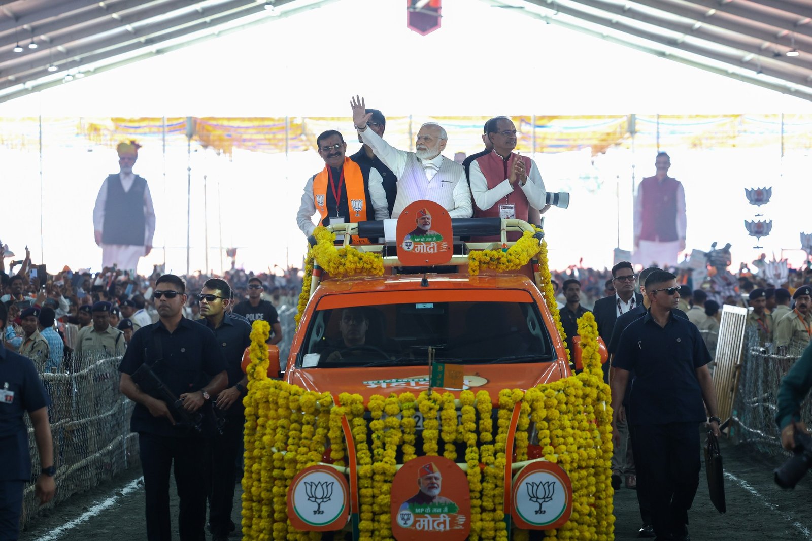 कार्यकर्ताओं का यह जोश दिखाता है कि मध्यप्रदेश के मन में क्या है? यह दिखाता है कि भाजपा नई ऊर्जा सेे लबरेज हैं। यह दिखाता है भाजपा कार्यकर्ताओं के हौंसले बुलंद हैं। इस दौरान संसद में 33 प्रतिशत महिला आरक्षण बिल पारित होने को लेकर पार्टी की महिला कार्यकर्ताओं ने मंच पर प्रधानमंत्री मोदी का अभिनंदन किया। पीएम मोदी के दौरे के साथ ही प्रदेश में भाजपा द्वारा निकाली गई पांचों जन आर्शीवाद यात्राओं का समापन भी हो गया। इस मौके पर सीएम शिवराज सिंह चौहान, केंद्रीय मंत्री एवं मप्र भाजपा प्रबंधन समिति के संयोजक नरेंद्र सिंह तोमर, केंद्रीय भाजपा प्रदेश अध्यक्ष वीडी शर्मा, भाजपा के राष्टीय महासचिस कैलाश विजयवर्गीय, केंद्रीय मंत्री प्रहलाद पटेल और ज्योतिरादित्य सिंधिया मौजूद थे।