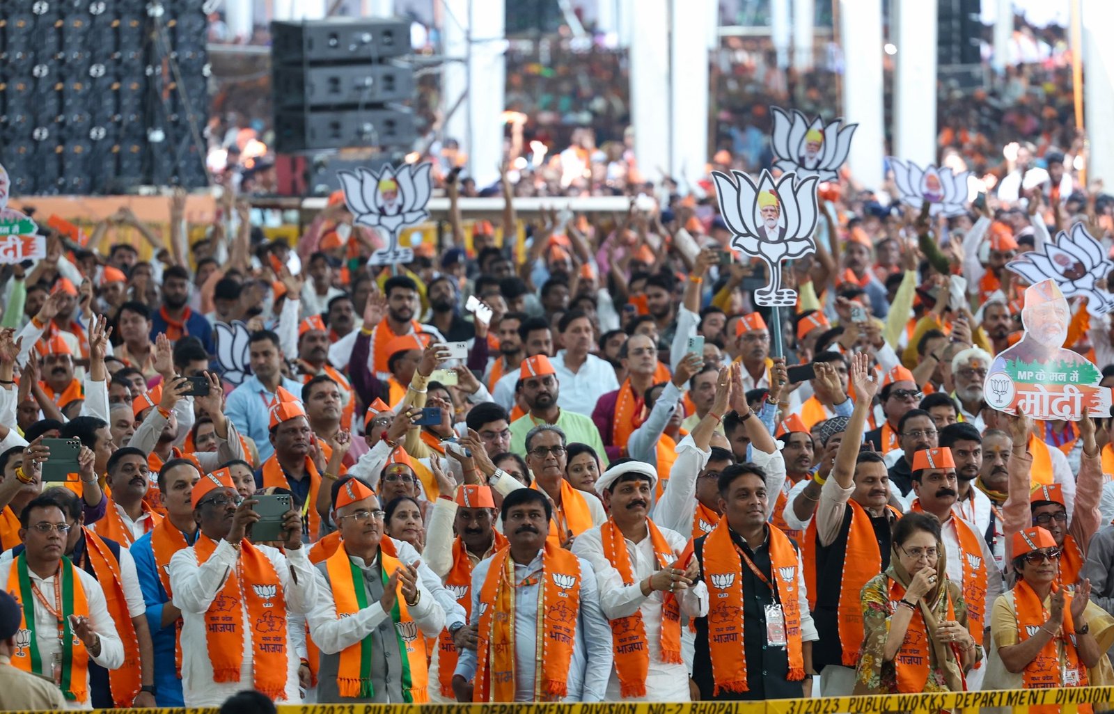 भोपाल । राजधानी भोपाल में मध्यप्रदेश में दो महीने बाद में होने वाले विधानसभा चुनाव के पहले कार्यकर्ताओं में जोश भरने और विजय संकल्प दिलाने के लिए भोपाल के जंबूरी मैदान में भारतीय जनता पार्टी के संस्थापक पं दीनदयाल उपाध्याय की जयंती पर आयोजित “भाजपा कार्यकर्ता महाकुंभ” में पहुंचे प्रधानमंत्री नरेंद्र मोदी ने चुनाव का शंखनाद किया और भाजपा कार्यकर्ताओं को जीत का मंत्र देते हुए कहा कि यह जन सैलाब, उमंग, उत्साह, महाकुंभ, महासंकल्प, बहुत कुछ कहता है।