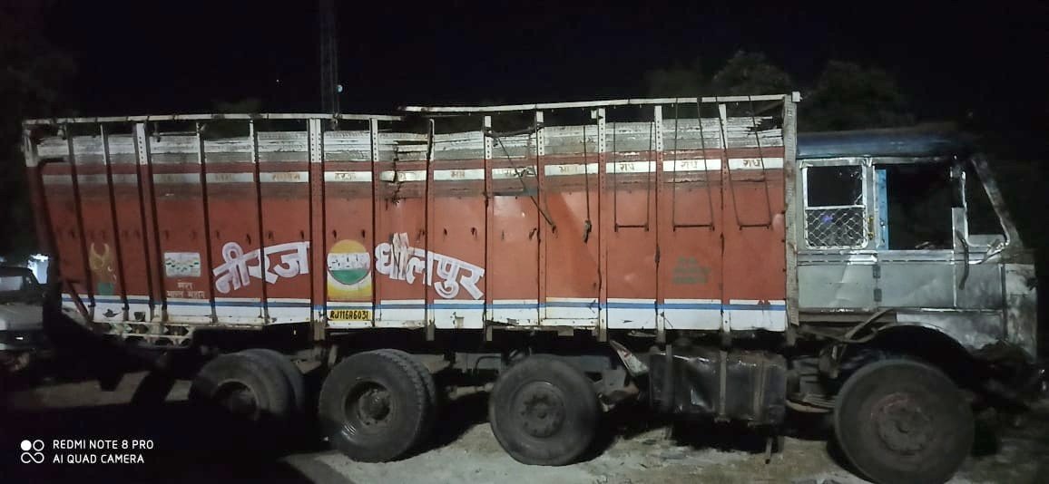 चैकिंग के दौरान पुलिस टीम को डबरा की तरफ से एक क्षतिग्रस्त ट्रक क्रमांक RJ11-GA-6031 आता दिखा, जिसे पुलिस टीम द्वारा चैकिंग के लिये रोकने का इशारा किया गया तो ट्रक चालक व दो अन्य व्यक्ति वाहन से कूदकर भागने लगे, जिन्हे पुलिस टीम द्वारा घेराबंदी कर मौके पर ही पकड़ लिया गया। पूछताछ करने पर ट्रक चालक ने ग्राम अयेला थाना सैंया आगरा (उ.प्र.) तथा दो अन्य व्यक्तियों ने धौलपुर (राजस्थान) का रहने वाला बताया।